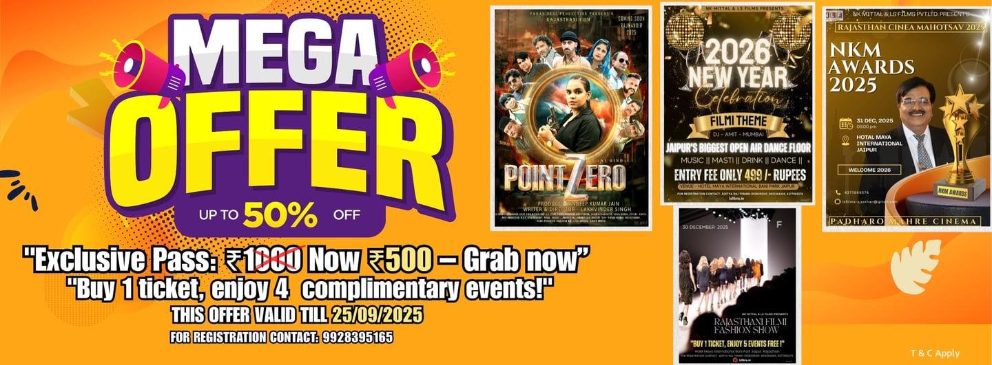 एक टिकट से दर्शक को फिल्म “पॉइंट जीरो”, 31 दिसम्बर न्यू ईयर पार्टी,एन के एम अवार्ड्स एवं फैशन शो (होटल माया इंटरनेशनल, जयपुर) में नि:शुल्क प्रवेश प्राप्त होगा।